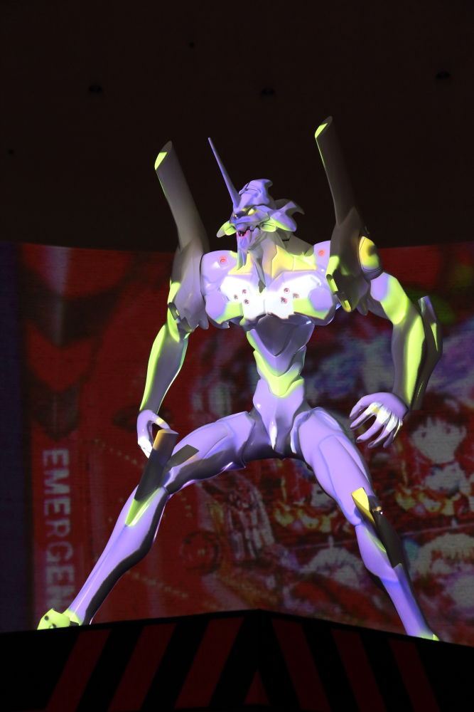 お披露目の舞台「飛天」は巨大スクリーンによる映像演出に加えて、初号機フィギュアへのプロジェクションマッピング(写真2枚目)などでエヴァ一色。エヴァンゲリオンファンとして有名なタレント加藤夏希さんは劇中の登場キャラクターの伊吹マヤのコスプレ(写真3枚目)で登壇し「エヴァファンとしてこういう形で触れることができるのはとてもうれしいです。いろいろ飛び出てアトラクションみたいで、画面も大きく全部の映像を見たくなりますね」と実機の感想を語っていた。試打コーナーには多くのホール関係者が来場。年末の注目機種となるだけに熱心に試打を行った。