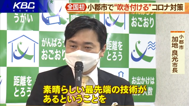 光触媒の一つであるイオニアミストプロを福岡県小郡市が採用し、小郡市役所と三国小学校に施工した。その模様が8月9日、九州朝日放送のローカルニュースで全国初の「吹き付ける」コロナ対策として紹介された。