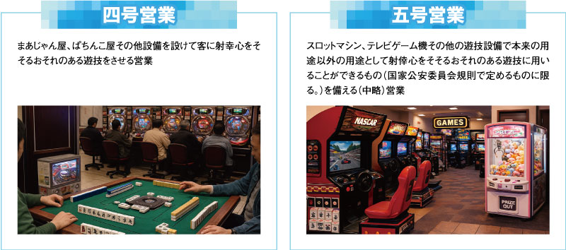 四号営業はパチンコ・パチスロなどを扱う営業で、パチンコホールがこれにあたる。五号営業はクレーンゲームやビデオゲームを扱う営業で、ゲームセンターなどの遊技機営業がこれにあたる。カプセルトイについては、法的な位置付けは飲み物などの自動販売機と同様になるので、今回のテーマで法的な問題となりうるのはクレーンゲームのみとなる。
