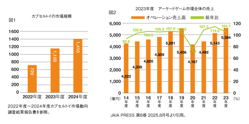 ここ数年、カプセルトイ市場は急拡大を続けており、日本カプセルトイ協会の推計によれば、2024年度の市場規模は約1410億円に達し(図1)、過去最高を更新したという。この数値は同団体が、カプセルトイを販売するメーカーへヒアリングを行って集計した数値であり、2022年よりこのヒアリング方式を採用して集計しているため、直近3年間の数値が市場の実態に非常に近しいとのことだ。