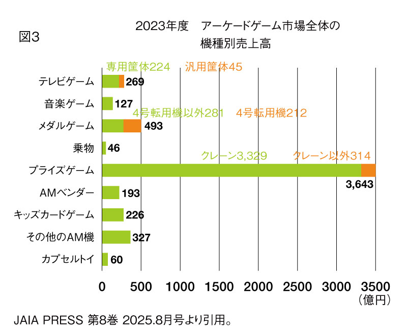 2023年度に限って見ると、アーケードゲーム全体での売り上げ合計が約5384億円(図2)。そのうちクレーンゲームの売上が占めるのが3329億円(図3)。全体の約61.8%がクレーンゲームの売上ということになり、いかにゲームセンターの売上げを、クレーンゲームが支えているのかが分かるだろう。