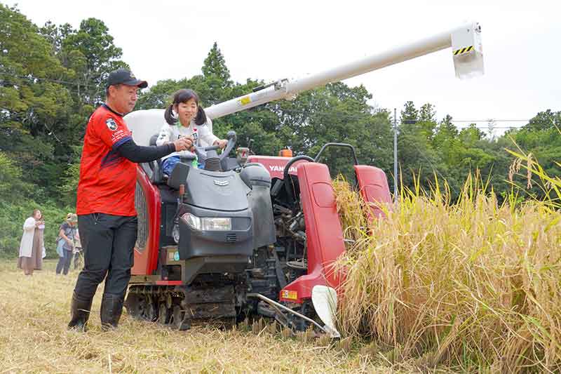 葉の色もつややかで、例年よりもやや黄金色が映えているような感じがします。白石さんが鎌を使って稲刈りのコツをいわきFCの選手たちにレクチャーしていきます。その後、コンバインに乗り込みザクザクと稲を刈っていきます。その音を聞いていると、手作業との違いを体感でき、「昔は全部手で刈り取っていたのか」と大変さを思わず想像してしまいます。