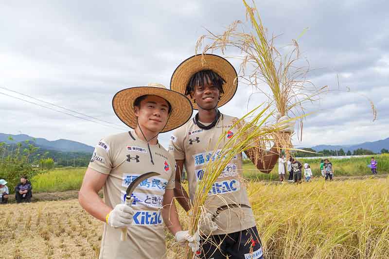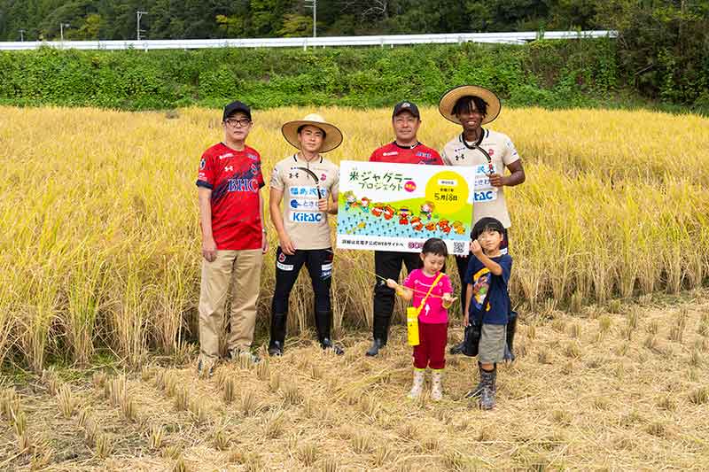 さて、10月4日、福島県いわき市で北電子による「米ジャグラープロジェクト」第8期の稲刈り体験が行われました。いわき市内で子どもたちに対する各種サポートを行う、「はまどおりサポートちるどれん」を通じて集まった20名の子どもたちや、J2リーグで戦ういわきFCからブワニカ啓太選手、坂岸寛大選手が参加。今年も黄金色に実った稲を鎌やコンバインに乗り込んで刈っていきます。