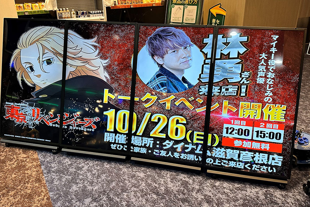 パチンコホール大手のダイナムは10月26日、滋賀彦根店の屋外特設ステージで人気アニメ『東京リベンジャーズ』の佐野万次郎(マイキー)役・林勇氏を招いたスペシャルトークイベントを開催した。滋賀県内で同作品とのコラボイベントは初となる。