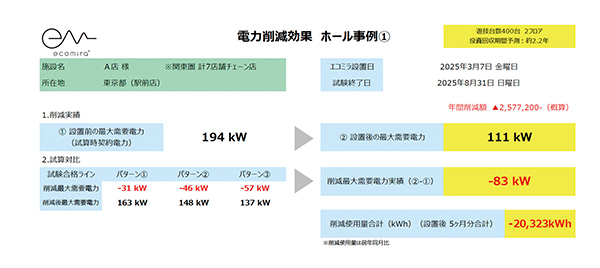 インタビューで尼子氏が話したように、導入前には必ず実地検証を行い、店舗の電力データや空調設備の構成を分析したうえで、削減効果を算出する「削減効果試算表」を提示。試験導入時の結果をもとに、削減率と投資回収期間を明示してから契約する仕組み。導入後に期待値を下回った場合は無償撤去・原状回復を行うなど、徹底したリスクゼロの姿勢が特徴だ。